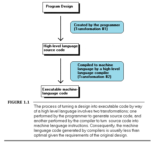 No matter how well an implementation is derived from the corresponding design, however, high-level languages like C and Pascal inevitably introduce additional transformation inefficiencies, as shown in Figure 1.1.