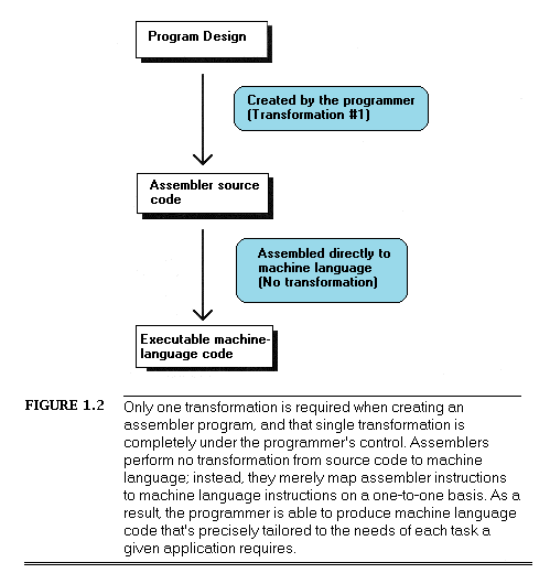Assembler, on the other hand, is simply a human-oriented representation of machine language. As a result, assembler provides a difficult programming environment — the bare hardware and systems software of the computer — but properly constructed assembler programs suffer no transformation loss, as shown in Figure 1.2.